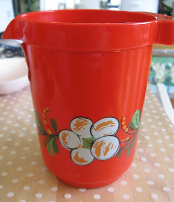 En röd vispbunke med allmogeinspirerad kurbitsmålning på står numer i skåpet.