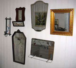 På en annan vägg i trapphuset satte jag upp ett gäng speglar som finns i hemmet. Tidigare har de mest stått och väntat i olika skrubbar, men nu får de hänga här ett tag.
